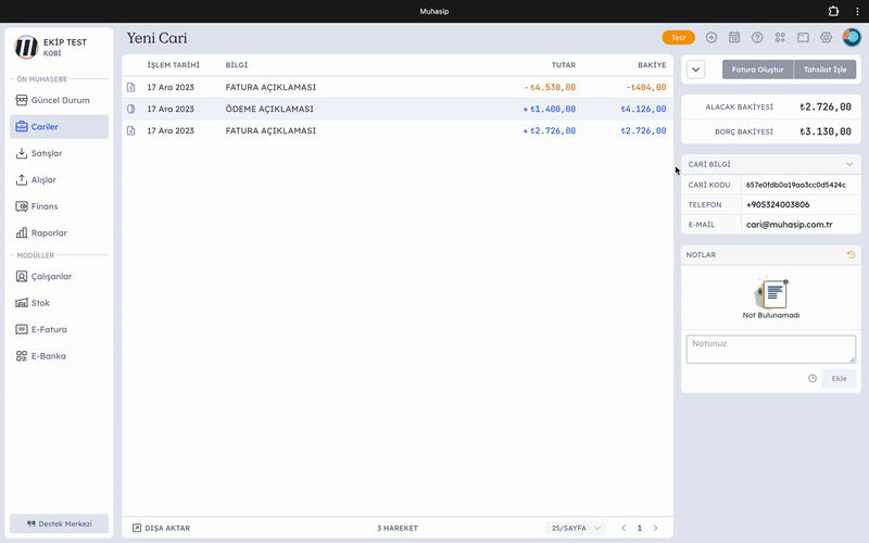 1.1. İlgili Cari ekranına ulaştıktan sonra oluşturduğunuz cari sizin tedarikçiniz ise ekranın sağ köşesinde bulunan Fatura Oluştur butonuna, müşteriniz ise ok ikonuna tıklayıp “Alış Faturası Oluştur”a basın.