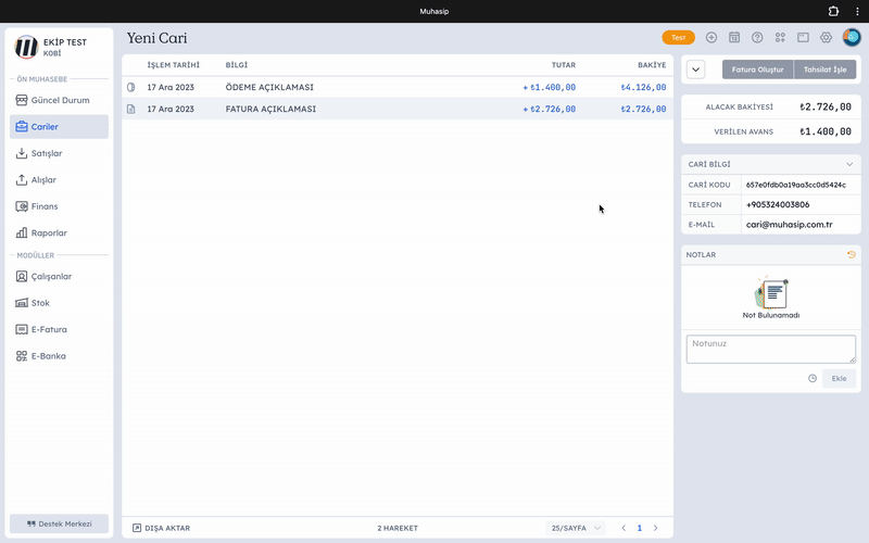 2.1. İlgili Cari ekranına ulaştıktan sonra işlem yaptığınız cari müşteriniz ise ekranın sağ üst köşesindeki “Tahsilat İşle”, müşteriniz ise ekranın sağ köşesinde bulunan ok ikonuna tıklayıp “Tahsilat İşle”yi seçin.