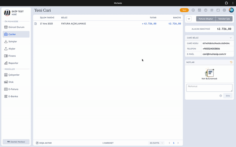 1. İlgili Cari ekranına ulaştıktan sonra oluşturduğunuz cari sizin müşteriniz ise ekranın sağ köşesinde bulunan Fatura Oluştur butonuna, tedarikçiniz ise ok ikonuna tıklayıp “Satış Faturası Oluştur”a basın.