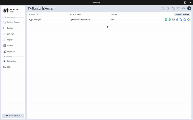 Yönlendirildiğiniz ekranda daha öncesinden Muhasip'e eklemiş olduğunuz bütün kullanıcıların listesine ulaşacaksınız. Bu listedeki herhangi bir kullanıcı ile işlem yapmak için ilgili kullanıcının üstüne tıklayın. Burada Ad Soyad ve Mail adresi bilgilerini dilediğiniz şekilde değiştirebilirsiniz.