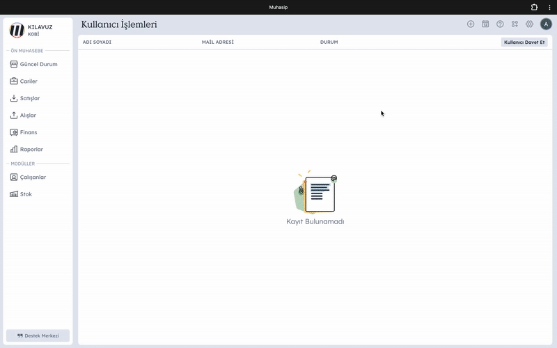 Yeni bir kullanıcı eklemek istiyorsanız Kullanıcı Davet Et butonuna tıklayın. Açılan pencerede Ad Soyad, Mail ve Yetki bilgilerini doldurduktan sonra davet et butonuna basın. Eklemiş olduğunuz mail adresine katılım için bir davet maili göndermiş olacaksınız.
